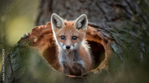 Fototapeta premium A curious red fox kit peeks out from a hollow tree trunk, surrounded by soft...