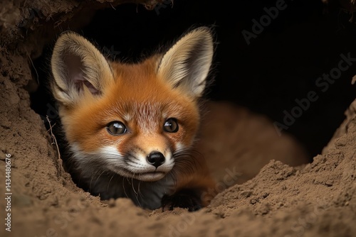 Fototapeta premium A curious red fox kit peeks out from its burrow, showcasing its captivating...