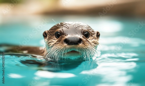 © NovaVision, Fototapeta premium A curious river otter swims towards the camera, its whiskers glistening in the clear water.