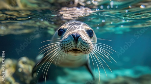 Fototapeta premium A curious sea lion swimming near the coast, its whiskers and sleek body...