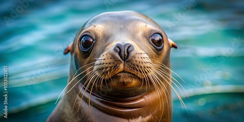 Fototapeta premium A curious seal pup with inquisitive eyes stares intently at the camera, its whiskers framing its face against a backdrop of shimmering turquoise water.