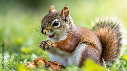 © almeera, Fototapeta premium A Curious Squirrel Enjoying a Snack in the Grass