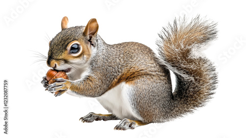 Obraz premium A curious squirrel holding an acorn with its bushy tail isolated on a...