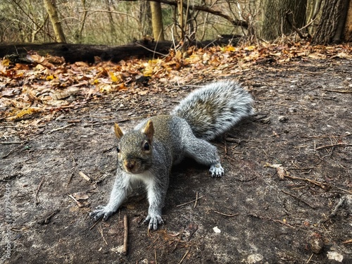 © KissCat, Naklejka premium A curious squirrel looking at a person in a park