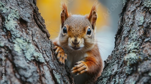 © Zikie_, Obraz premium A curious squirrel peers out from behind a tree trunk