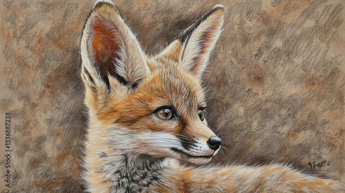 © otter2, Naklejka premium A curious young fox gazing forward, its fur a mix of russet and golden hues, ears perked up