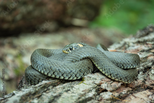Obraz premium A curled grass snake lying on a tree trunk, closeup