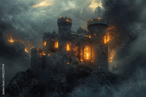 Fototapeta premium A cursed castle with crumbling stone walls, eerie glowing lights inside, and dark storm clouds swirling overhead.