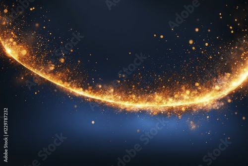 © Shahid Mehmood/imageBROKER, Obraz premium A curved orange glowing light streak with sparkles against a dark blue background, AI generated