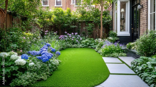 © lililia, Fototapeta premium A curved path of grey pavers meanders through a colorful garden, leading to an old door set in a brick wall, all framed by a bright green lawn and wooden fencing