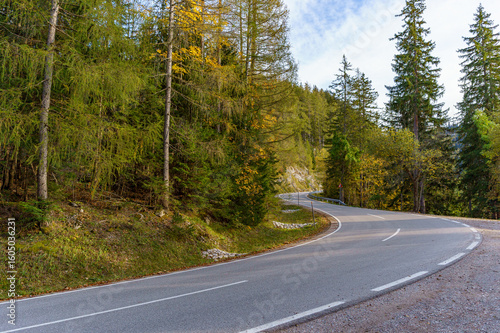 Naklejka premium A curved paved road winds through a forest of evergreen and yellow-leaved...