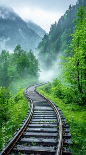 Fototapeta premium A curved railway track winds through a vibrant green forest and misty...