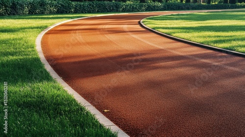 © Ariestia, Obraz premium A curved reddish running track surrounded by green grassy areas