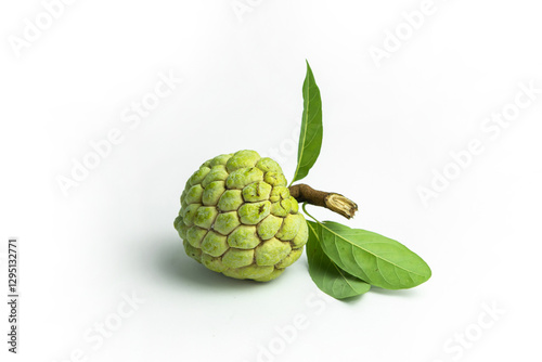 © VanK Ngn, Obraz premium A custard apple with green leaves and a stem is isolated on a white background, viewed from a high angle