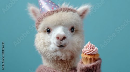© phy, Naklejka premium A cute alpaca wearing a party hat and holding a pink cupcake with pink frosting, standing against a blue background.