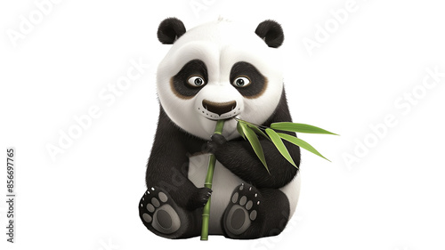 © Teerasak, Fototapeta premium A cute and fluffy baby panda sitting down while holding a piece of bamboo, set against a white background.