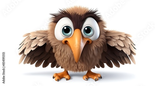 Fototapeta premium A cute and fluffy cartoon owl with big eyes and a friendly expression. The owl is standing on a white background and has its wings spread out.