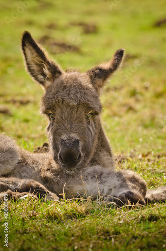 © Brinja, Fototapeta premium A cute and fluffy littel donkey foal in the meadow in springtime