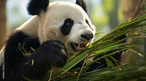 © Ameer, Fototapeta premium A cute and fluffy panda enjoying a bamboo snack in a green forest