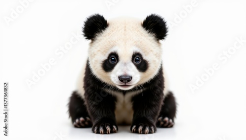 © Thi, Naklejka premium A cute and fluffy panda is sitting upright, with its black and white fur shining against a clear white background