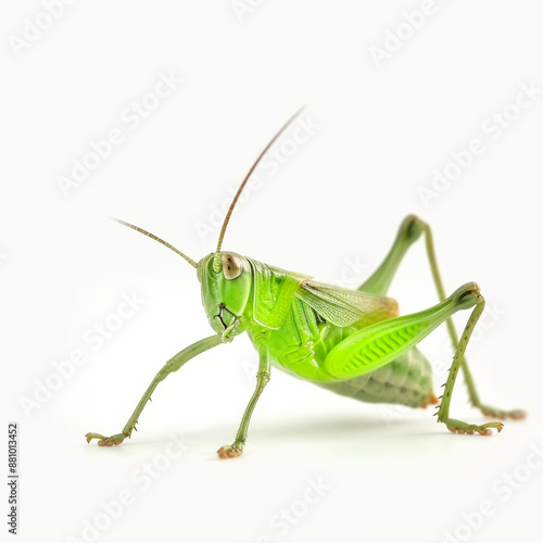 © EnricaDjango, Fototapeta premium A cute and funny grasshopper is jumping along a strip. White background