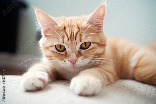 Fototapeta premium A cute and playful tabby cat with fluffy fur lies on a comfortable sofa,...