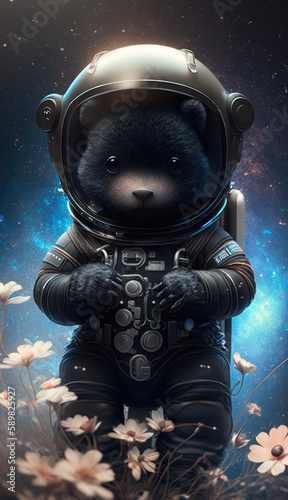 © Happy Prompt, Fototapeta premium A cute baby black bear astronaut in space with floral and space background. Generative AI technology.