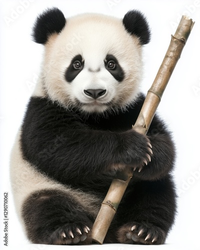 © NataliPro, Fototapeta premium A cute baby panda sitting and holding a bamboo stick against a white background.