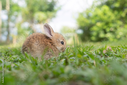Fototapeta premium A cute baby rabbit was running and biting the grass in the yard. Rabbits are small animals that people are popular to bring as pets.