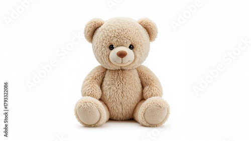 © Lasvu, Obraz premium A cute beige teddy bear with a friendly face and round ears sitting upright.