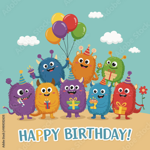 © Krezzo Art, Naklejka premium A cute birthday illustration with cats and a birthday cake, complete with lit candles and festive decorations.