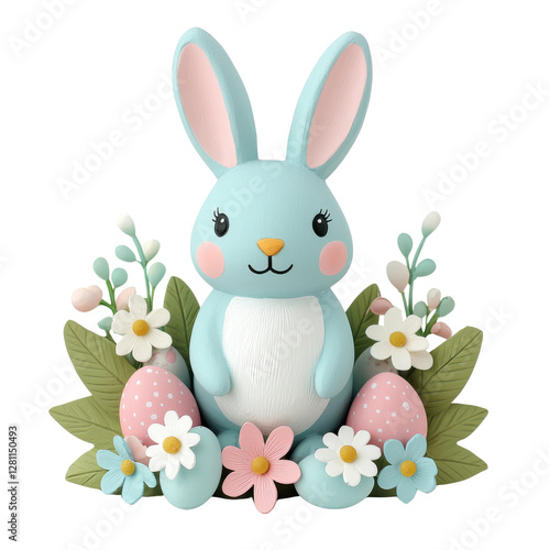 © Cherrin, Obraz premium A cute blue bunny surrounded by colorful flowers and decorative eggs, embodying a cheerful, springtime theme.