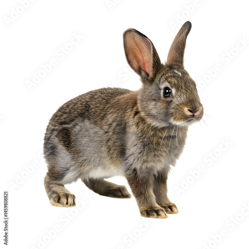 Fototapeta premium A cute brown rabbit standing on a white background, showcasing its fluffy fur and alert expression, ideal for nature themes