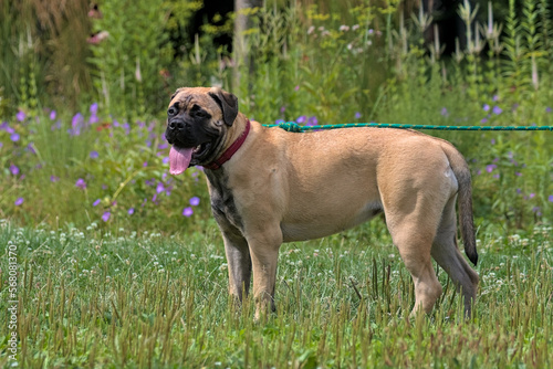 Fototapeta premium A cute bullmastiff walks on the green grass in a summer park. Pets. Krakow, Poland.
