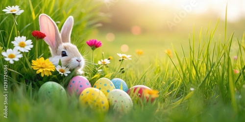 Fototapeta premium A cute bunny surrounded by colorful eggs and flowers in a sunny, vibrant...