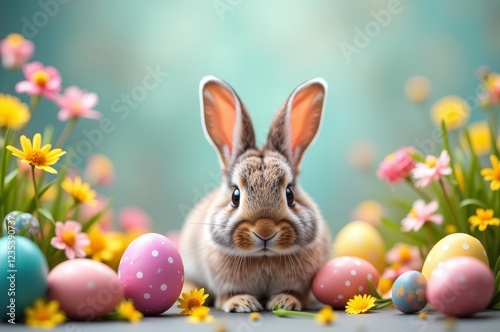 Obraz premium A cute bunny with fluffy fur and long ears, surrounded by colorful eggs and flowers
