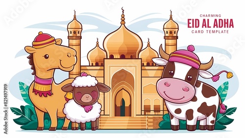 Naklejka premium A Cute Camel Sheep Cow And Mosque Background illustrations, Ai generative.