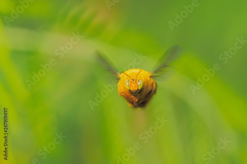 © Yuttana Joe, Fototapeta premium a cute Carpenter Bee flying with green leaf in nature blurred background. Carpenter Bee guarding the nest.