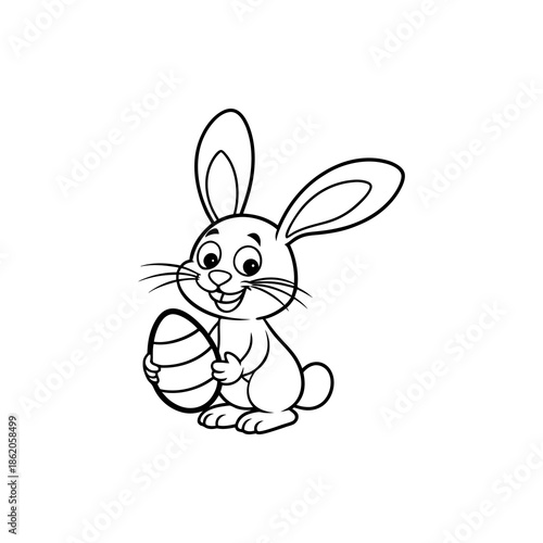 © davis, Fototapeta premium A cute cartoon bunny rabbit holding a striped Easter egg, ready for coloring.