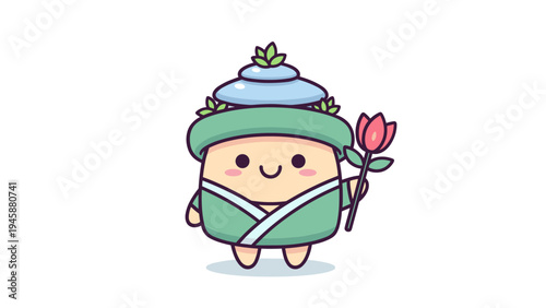 © Diljan Stock, Fototapeta premium A cute cartoon character wearing a traditional green robe and a stack of blue bowls on its head Vector