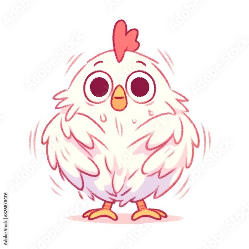 © Chatchalee, Fototapeta premium A cute cartoon chicken with big eyes and a fluffy body stands against a white background.