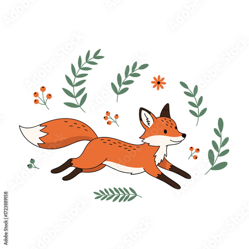Naklejka premium A cute cartoon fox running through the forest with leaves and berries.