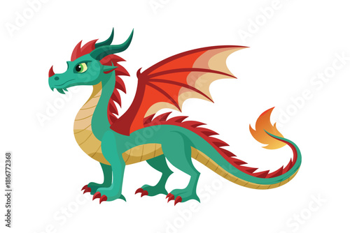 Fototapeta premium A cute cartoon green dragon with red wings standing majestically isolated on white background