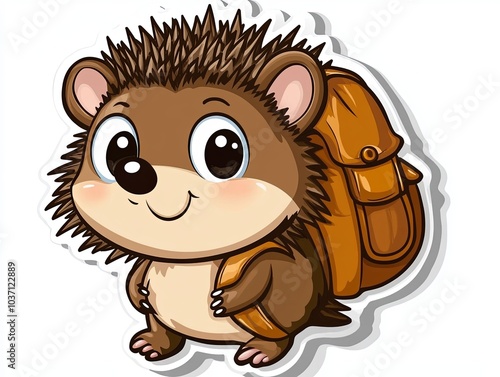 Obraz premium A cute cartoon hedgehog wearing a brown backpack, with big eyes, and a big...