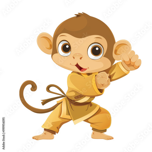 Fototapeta premium A cute cartoon monkey in a yellow karate gi, striking a fighting pose.