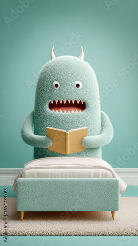 Obraz premium A cute cartoon monster reads a bedtime story in this whimsical 3D illustration for kids.