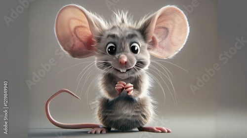 © aan, Obraz premium A cute cartoon mouse with oversized ears, a pink nose, shiny fur, and a bushy tail sits charmingly, radiating warmth against a soft gray background.