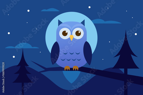 Naklejka premium A cute cartoon owl couple perched on a moonlit tree branch against a blue...