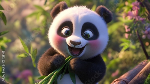 Fototapeta premium A cute cartoon panda cub with rosy cheeks happily eats bamboo shoots in a lush green forest.