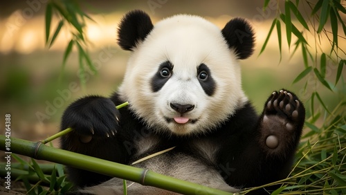 © BABAY, Naklejka premium A cute cartoon panda eating bamboo, 2D animation, white background